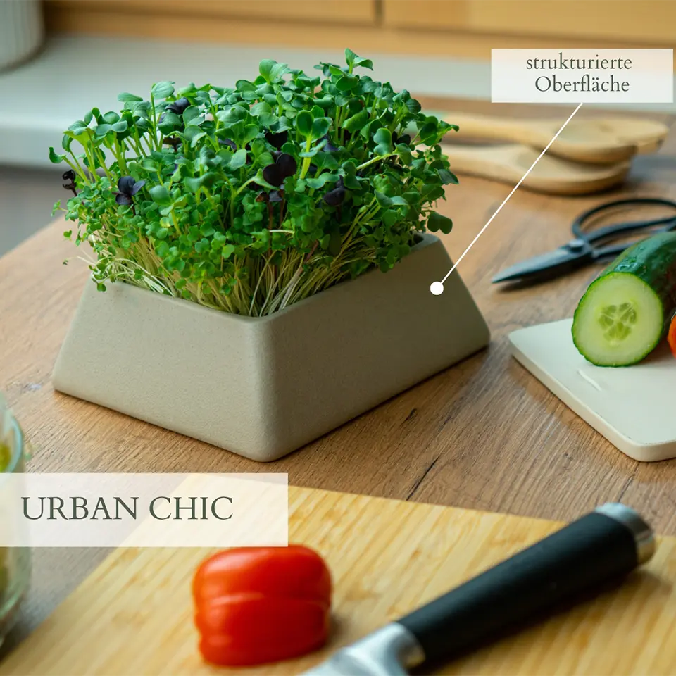 Das stylische Homegrowing Kit für Bio Microgreens ist das perfekte Accessoire für jeden, der Wert auf Nachhaltigkeit, Qualität und Gesundheit legt und Microgreens ohne Gießen pflanzen möchte. Aus hochwertigen Materialien und in Handarbeit gefertigt, ist es einzigartig und kann immer wieder verwendet werden.